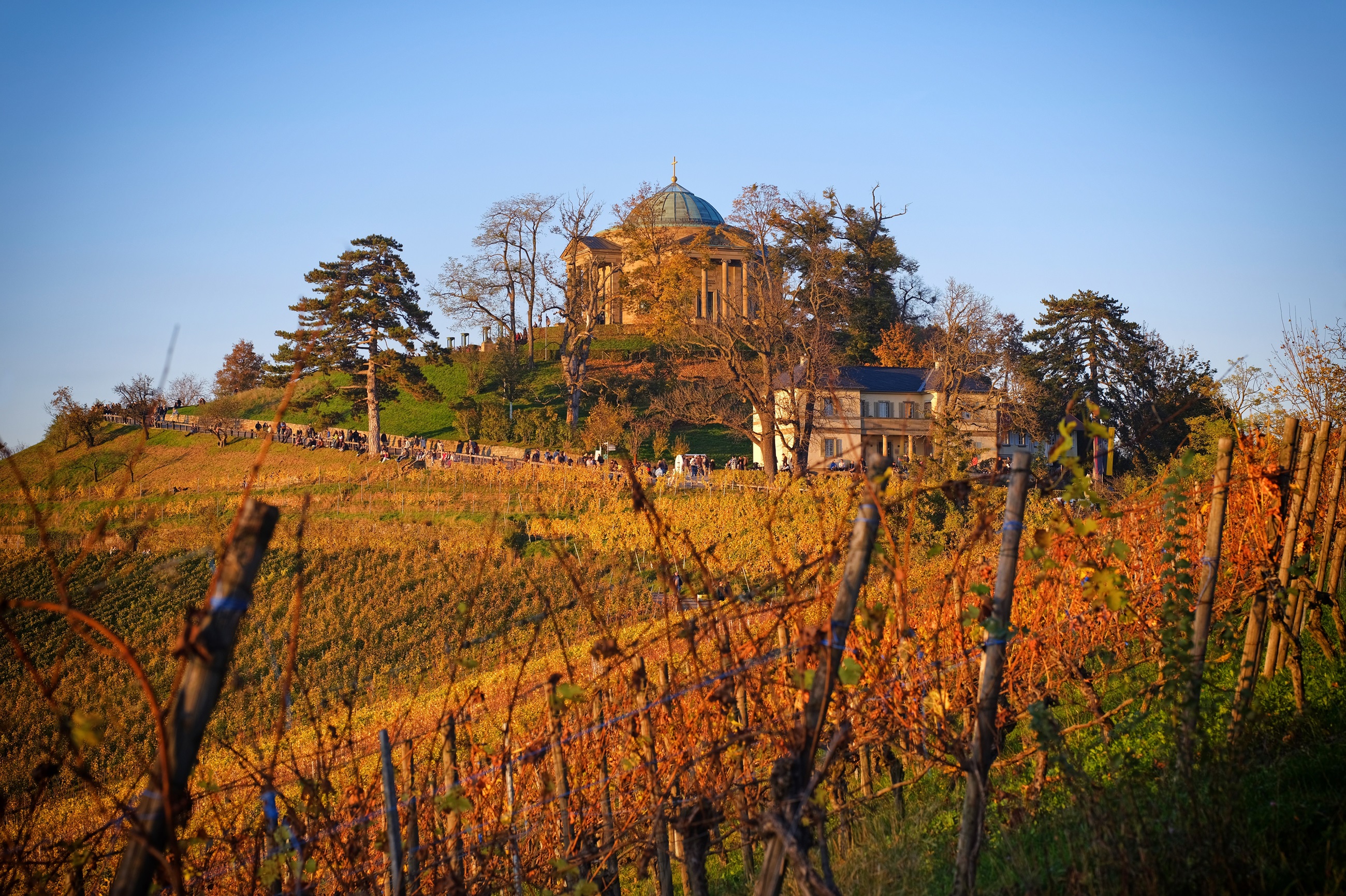 Ein farbenprächtiges Spektakel bietet die Grabkapelle auf dem Württemberg in Stuttgart: Beim „Herbstzauber“ an allen vier Sonntagen im Oktober erstrahlt das Mausoleum in festlicher Atmosphäre. Kleine musikalische Beiträge, selbstgebackene Kuchen und etwas Rahmenprogramm von lokalen Vereinen verschönern den Besuch der Grabkapelle, die mitten in den Weinbergen, hoch über der Stadt liegt. Ein besonderes Highlight im Spätherbst ist die Sonderführung „Licht aus – Spot an“ am Sonntag, 26. Oktober, um 18.00 Uhr: Dann offenbart die Grabkapelle im Spiel von Licht und Schatten ganz neue Facetten.